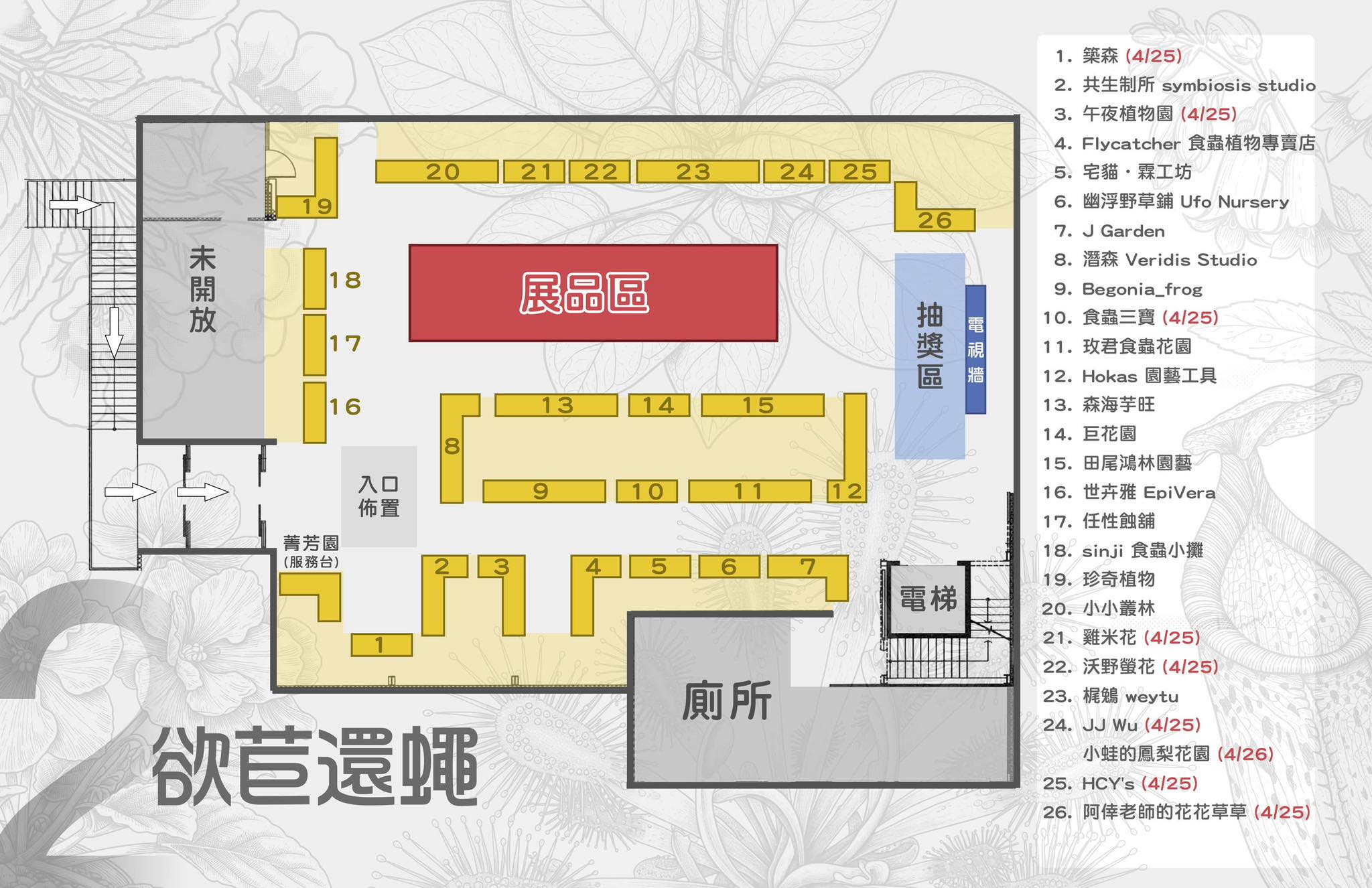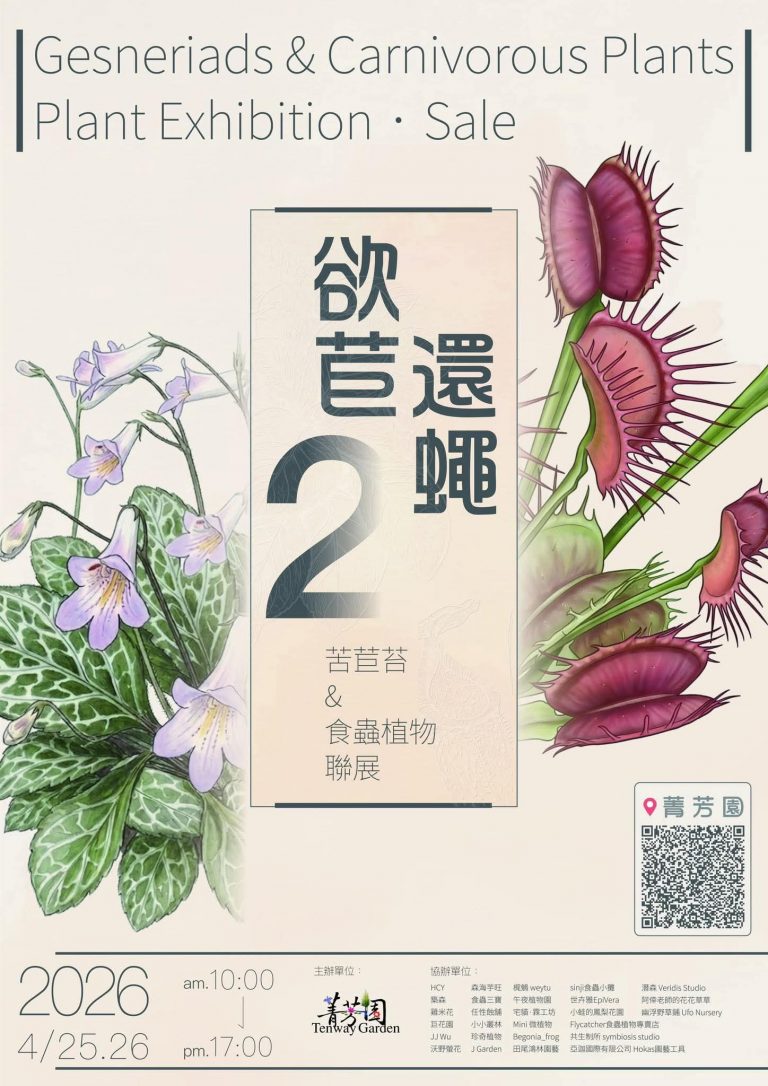 2026「欲苣還蠅」苦苣苔與食蟲植物展 活動資訊.時間:2026.4.25-26(六.日)(部分品牌僅參加25號).地點:菁芳園2樓展覽館(彰化縣田尾鄉張厝巷73號).主題:苦苣苔科植物與食蟲植物販售與展示.費用:免費.交通資訊:https://reurl.cc/DdVyqd 《欲苣還蠅2》攤商位置介紹 黃鐘逸所主持的抽獎活動。 十點才開始的活動,提前來排隊的人潮。 漂亮地爆花苦苣苔 罕見的捕蠅草 苦苣苔的美花 喜蔭花之美 歡迎瀏覽Facebook資訊※https://www.facebook.com/share/p/1A36UEdhSK/※https://www.facebook.com/share/p/1NkkpobUuS/※https://www.facebook.com/share/p/1aPriUBo3t/※https://www.facebook.com/share/r/17qQprmZzH/ 文章導覽 【FAQs】 美味與購物 FOODS & SHOPPING